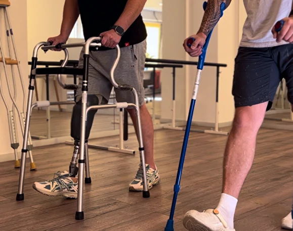 Всё обучение в нашей школе ходьбы построено на постепенном «знакомстве» с протезом. Сначала наши специалисты показывают, как его правильно надевать. Потом учат садиться и вставать, чтобы обрести уверенность. Пациенты постепенно начинают чувствовать своё тело по-новому — и это один из самых важных этапов.